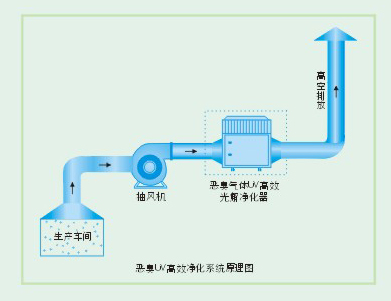 第二部 破壞氣體分子鏈:惡臭氣體利用排風設(shè)備輸入到凈化機后,利用特制(調(diào)制不同的光強和波長)的高能紫外線光束照射惡臭氣體,改變惡臭氣體如:硫化氫、氨、甲硫醇、甲硫醚、二甲二硫、二硫化碳等,使有機或無機高分子惡臭化合物分子鏈,在高能紫外線光束照射下發(fā)生降解,從而轉(zhuǎn)化成低分子化合物或易氧化的分子。